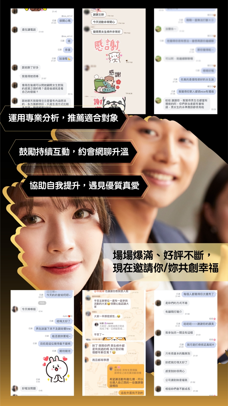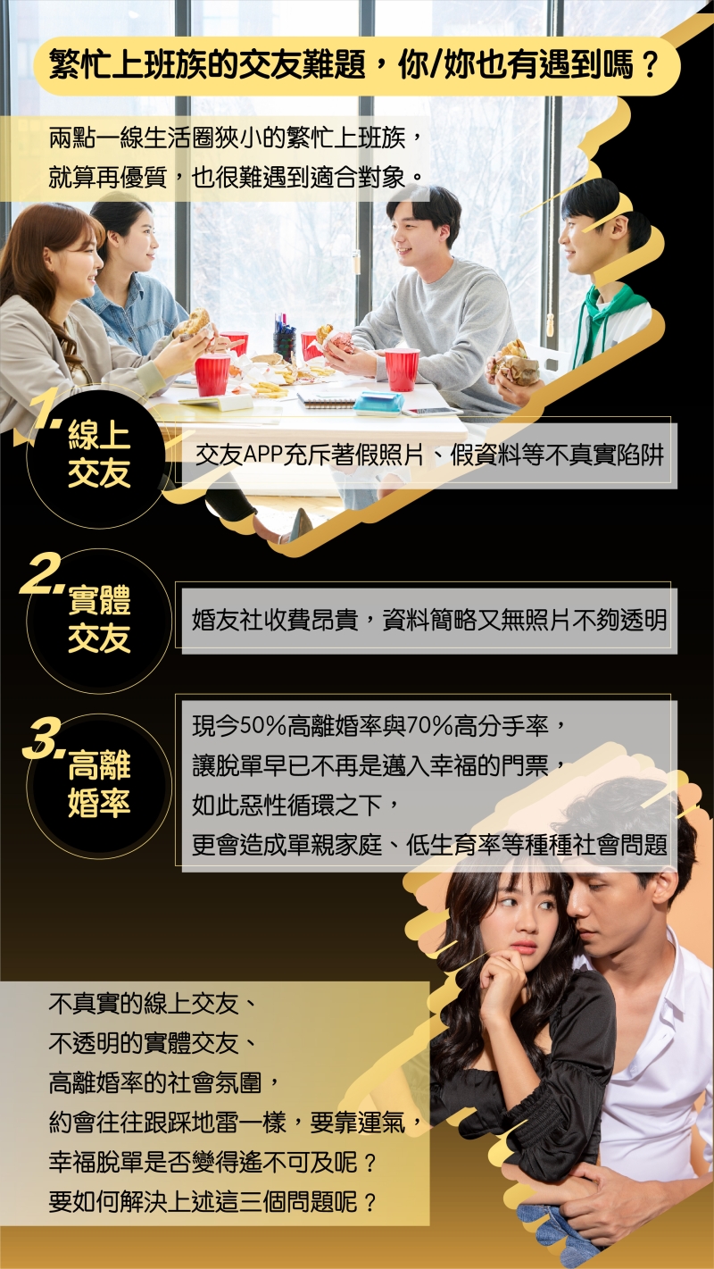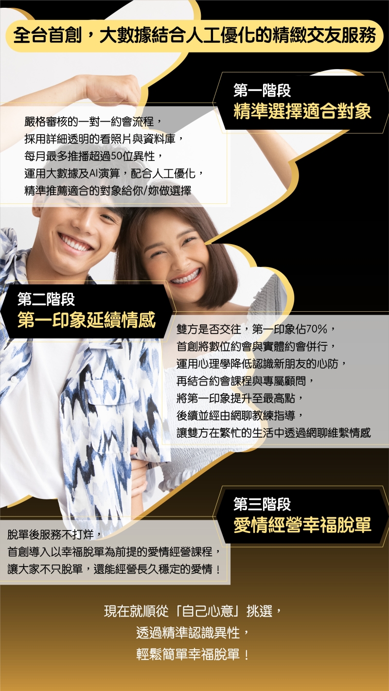 我們除了科技外,會有課程訓練大家找到適合對象,幸福脫單,所以其實大家多會在非單身的狀態下~