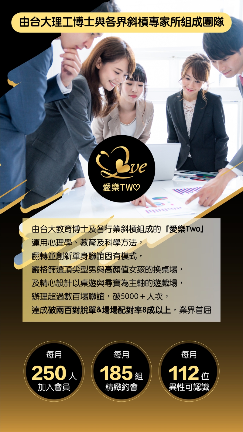 為了解決線上交友、實體交友、高離婚率等問題,愛樂Two將單身聯誼科技化,並達成全台最高配對率!