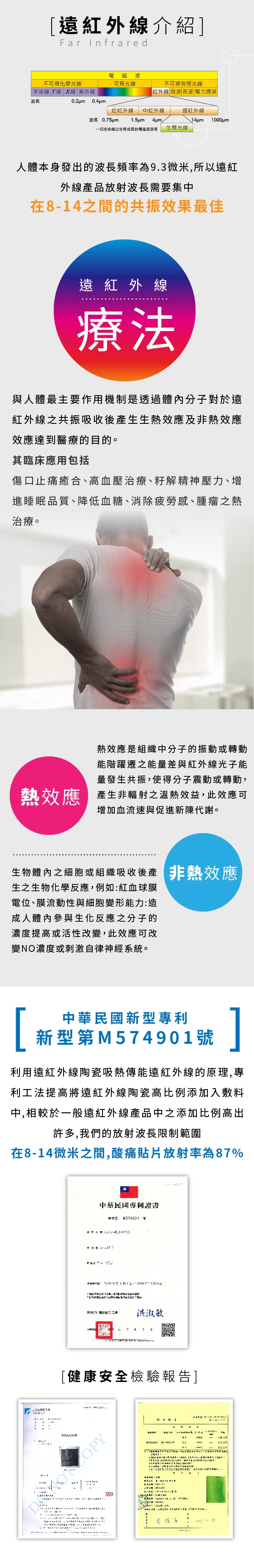 您好,目前遠紅外線的應用已經在醫學上有很多的使用唷.主要是使用在不同的狀況時,放射率與使用時間與強度都不同,目前我們的貼布也有在復健科販售,主要針對疲勞,姿勢性的僵硬與運動過後的痠痛都可以使用