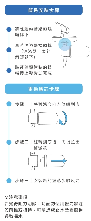 3~6個月更換一次沐浴器補充芯,但需視水質狀況用水量而異,以確保用水品質。