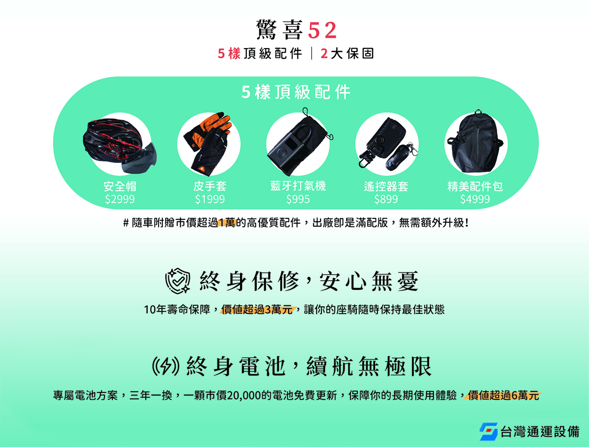 隨車附贈五大優質配件, 一年保固, 終身保修