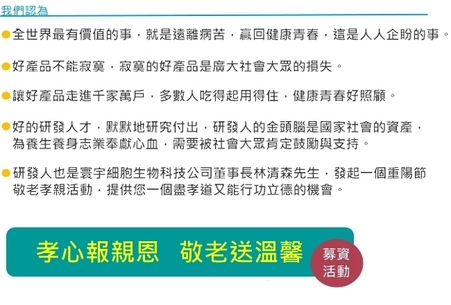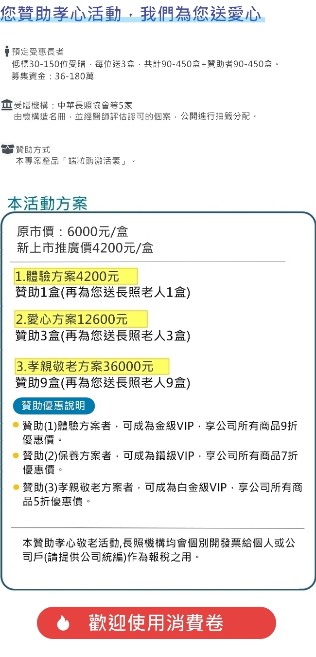 凡贊助捐贈端粒酶激活素給中華長照協會者,我們也相對用您的贊助盒數,送給您或家裡的老人食用 ,讓您與受贈的老人能成為我們最忠實的愛用者見證者,共同打造高貴不貴俗而不俗的產品,受到大家的肯定與愛用,邁向普及化。