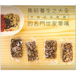 「手工芝麻四色軟糖」集結養生之大全的名門世家零嘴 以黑芝麻為基底,佐以白芝麻、南瓜子、枸杞等堅果讓您在享受美味幸福的同時,同時滋養疲憊的身心。 6瓶一組(含運費)!!每瓶290元