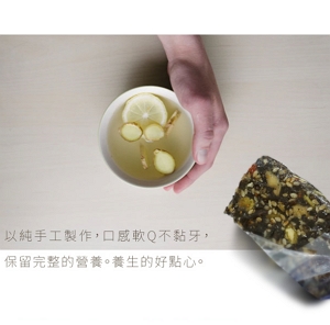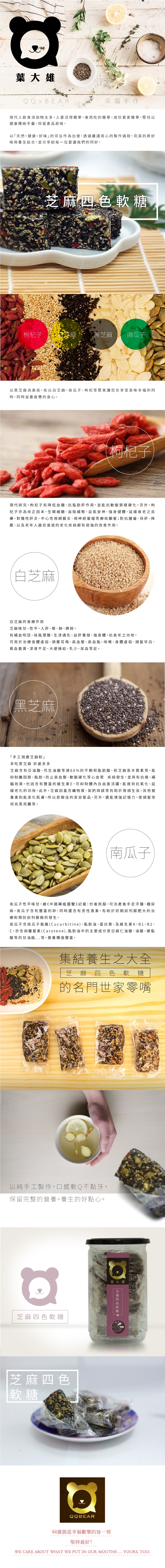 葉大雄的幸福手物工坊-「手工芝麻四色軟糖」集結養生之大全的名門世家零嘴 以黑芝麻為基底,佐以白芝麻、南瓜子、枸杞等堅果讓您在享受美味幸福的同時,同時滋養疲憊的身心。 當然,我們明白外面有許多零食點心總是忽略了素食者的辛苦,葉大雄幸福手作工坊 也給您最高保證:本產品奶素者可食,不添加香料、色素、防腐劑,一起為世界環保邁進一步。