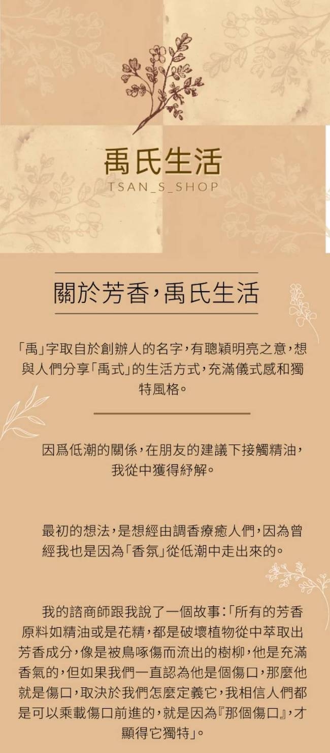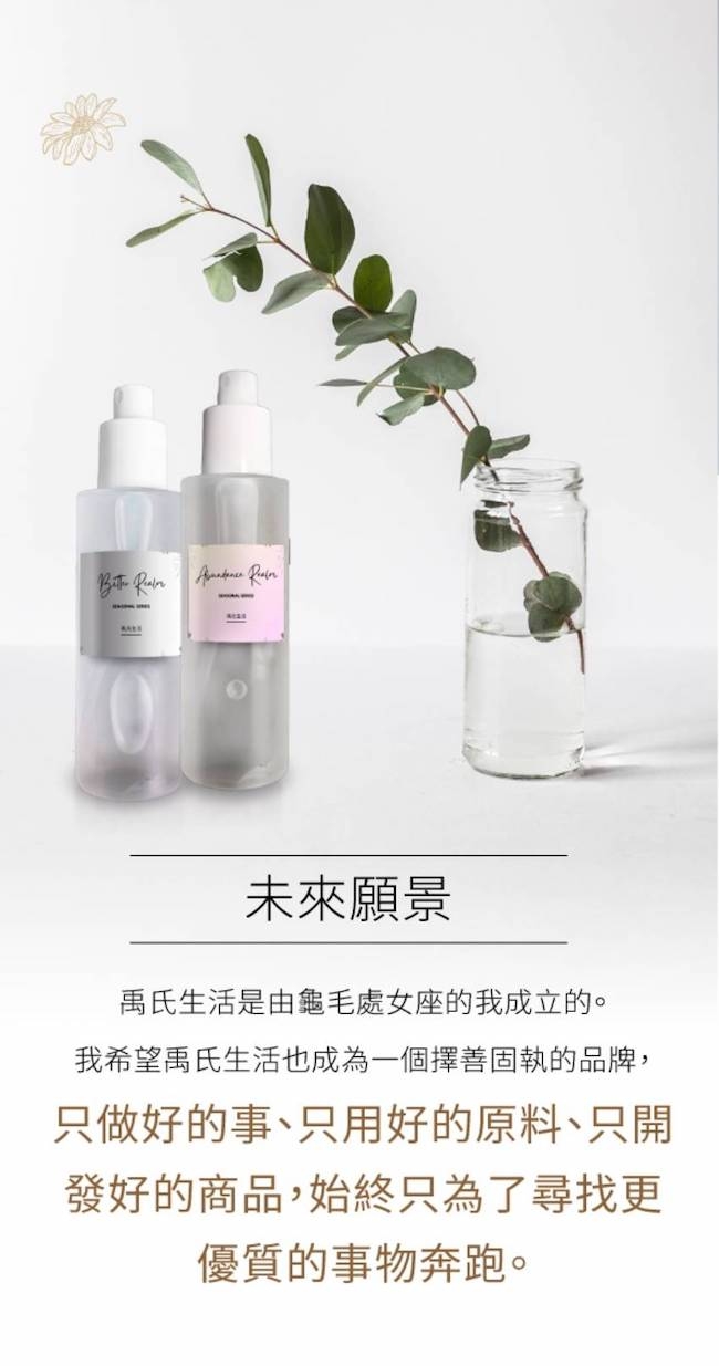 禹氏生活以台灣季節與氣侯為發想中心,從一年四季開始,到各個城市與不同時分。如北部的潮濕氣候_泥土調。南部的歷史溫情_木質調; 作為延伸聯想,以及一年的孟仲季。 徂台灣的四季為出發點獨家創作,分別為: 春_盎然之境、夏_絢爛之境 邱_虛實之境、冬_凜冽之境