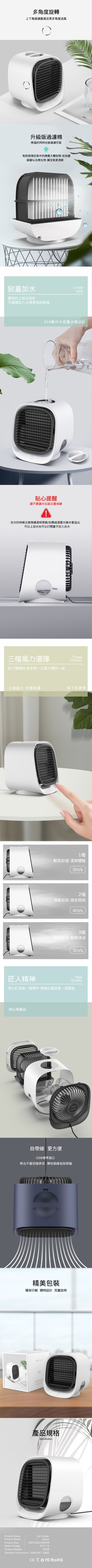 夏天想開冷氣但又怕電費太貴嗎? 一個人吹冷氣耗電又不環保? 您需要這台「ComAIRX四合一移動水冷氣」輕鬆解決您的困擾 奈米水霧渦輪聚風,300ml水箱設計,開蓋可直接加水 加入常溫水便可降溫攝氏3-5° 使用冷水更是可以降溫攝氏5-7° 製冷環保,不需冷媒,為守護地球盡一份心力 讓您的夏天變的更涼爽 低分貝無輻射靜音技術,大功力超靜音冷風新方式 水冷氣產生的聲音甚至不到50分貝,老人小孩皆可安心使用 健康負離子清新呼吸,一鍵釋放上百萬負離子,感受負離子帶來的清新空氣,升級版過濾棉可有效阻隔空氣中的塵埃微粒,輕鬆享受更健康的空氣環境 把大自然搬回家,模擬春天清晨自然風的涼爽舒適 自帶柔光炫彩,七色夜燈,提升生活情調,滿足睡眠需求 三檔風力選擇,按下按鈕可加大一級風力,最多三檔 出風口可旋轉,上下調整即可滿足更多角度送風 自帶USB線,再也不用為了找不到線感到煩惱