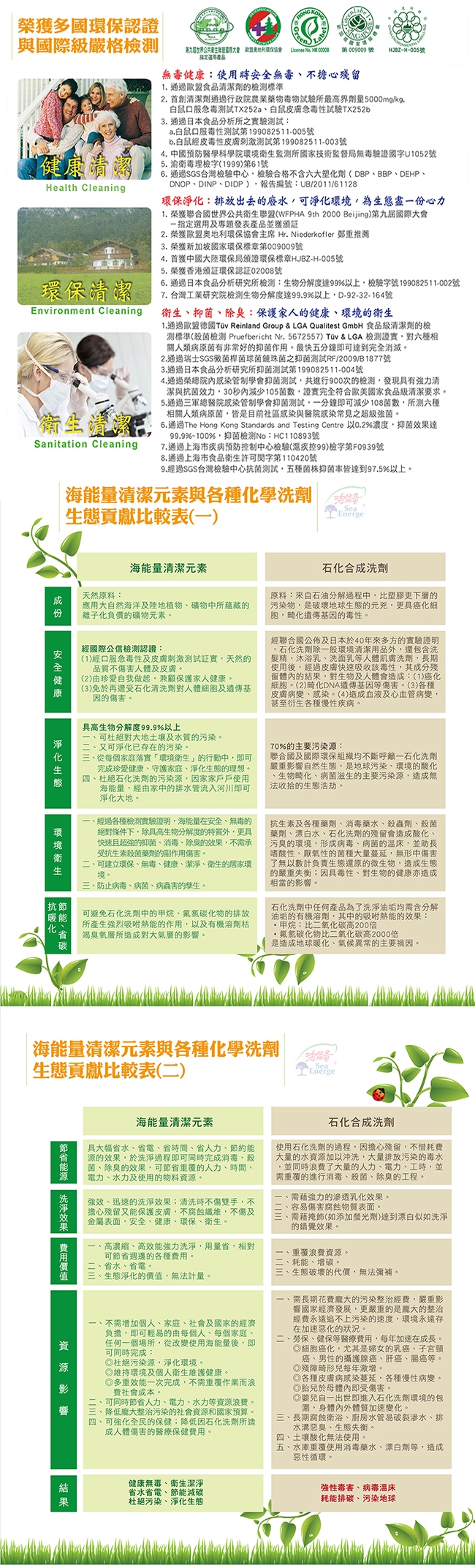 海能量硒能健康洗衣精全成分取自蘊藏於無汙染內陸海及高海拔陸地的珍貴礦物資源及萃取自漢方本草的植物精華,採用友善環境無毒無味零排放零污染的專業生產,符合國際CSR ESG的永續發展目標。