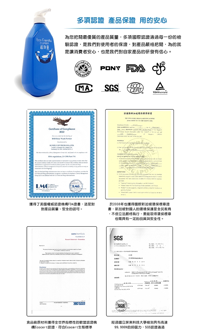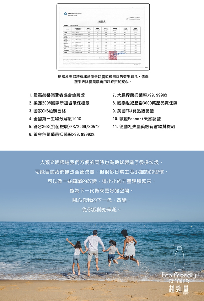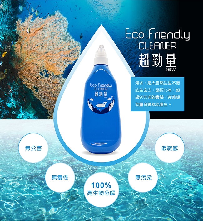 我們深信,海水是大自然生生不息的生命力來源,在研究者努力不懈的開發下,歷經15年,超過9,000次的實驗如此優質的天然洗劑,使用的是歐美知名的昂貴原料,深受日本、澳洲、美國、德國的喜愛,是目前全世界最天然且環保的洗劑,各種實驗數據齊全,殺菌力特強。