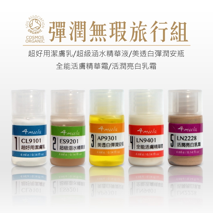 贈送「彈潤無瑕一週旅行組」 【 組合內容 】 超好用潔膚乳4ml 超級涵水精華液4ml 美透白彈潤安瓶4ml 全能活膚精華霜4ml 活潤亮白乳霜4ml