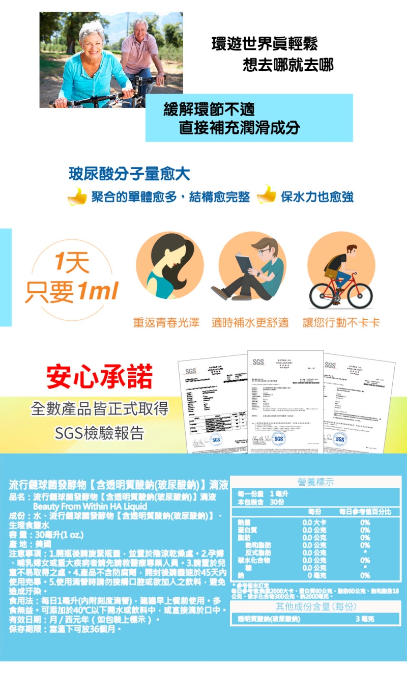 • 當年紀漸增時,身體漸漸無法自己生產玻尿酸,因此透過健康食品來補充玻尿酸是必須的。