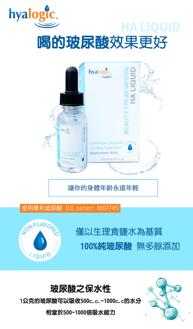 Hyalogic™於2001年成立於美國密蘇里州,創始人Darren、Mark、Tom致力於發展現有產品之替代物(例如:葡萄糖胺)來促進關節健康。經過多次的研究及測試,口服玻尿酸誕生了,並於2001年正式開始販售,Hyalogic™成為全美第一個口服玻尿酸液的生產供應商。