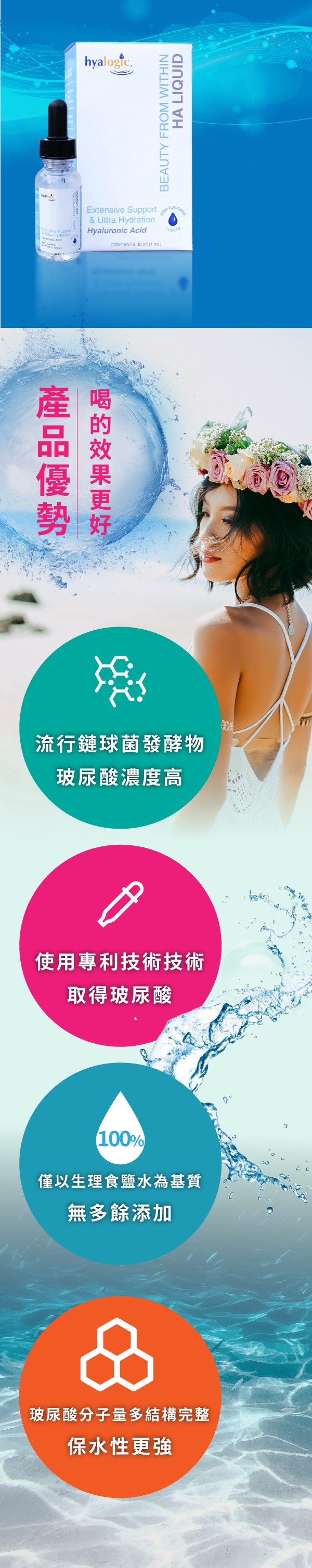 • 玻尿酸是皮膚組織的重要成份,可使皮膚保持年輕無皺紋的外觀。