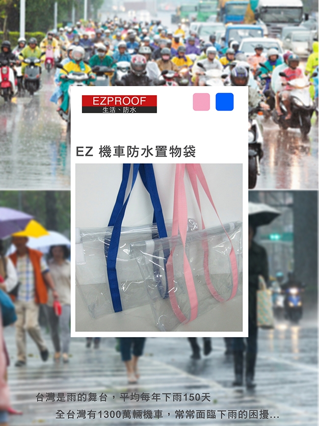 台灣每年各地平均下雨150天。(中央氣象局資料) 至2016年底,全台機車超過1300萬輛。(主計處統計) 也就是說,每年數以百萬計的機車族,會有1/3的時間會受到雨天困擾。 市面上防護身體不淋濕的雨具很多,保護物品不淋濕的卻很少。 其實物品跟包包也需要被保護, 包包淋雨會發霉,東西淋雨會壞掉。 因為自己也有困擾,所以我們研發簡單好用的"機車防水置物袋" 平常可摺疊收納在後座下,下雨時包包、物品就可以放進去。 結構看起來簡單,但因為房與結構跟無針孔工法,我們可是有專利的喔! 不管颱風天、大雨天,狂風暴雨都不怕東西碰水喔! 簡單實用的雨天小物,獻給全台的機車族。