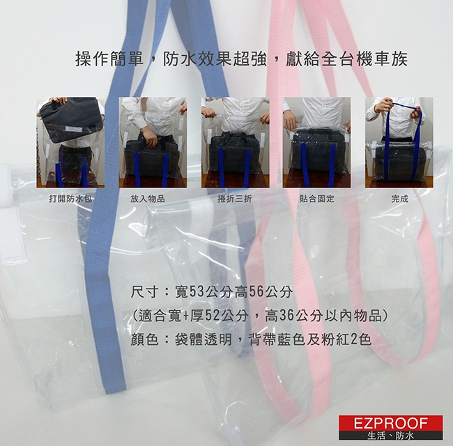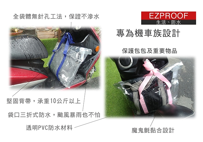 專為機車族雨天困擾設計, 袋口三折防水結構,狂風暴雨也不會進水。 袋體無針孔特殊工法,絕不會滲水。 支撐式背帶設計,承重可達10公斤以上。 尺寸適中,可放下公事包、手提包、安全帽。 台灣設計研發、新型專利。 使用簡單方便,一開、二放、三折,10秒內操作完成。 袋體為全防水材質,不吸水不滲水。 背帶為尼龍材質,堅固耐用。 除了騎車之外,雨天出門也非常好用。 可裝下寬+厚52公分,高36公分以內包包或物品。