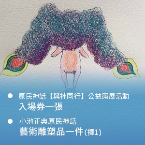 藝術家小池正典在距離台北2,099公里的東京,為充滿了自由與想像空間的原民神話重新演繹、賦予新形象,讓小巧的神話人物鮮活地跳出祂們的地盤,在眼前與你對話,並贈送【與神同行】公益策展活動的入場券一張。