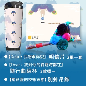 ●【Dear 我想跟你說】明信片/ 3張一套 ●【Dear 我對你的愛隨時都在】隨行曲線杯/ 3款擇一 ●【關於愛的枝微末節】別針吊飾/ 一個 ●原民神話【與神同行】公益策展 / 入場券一張