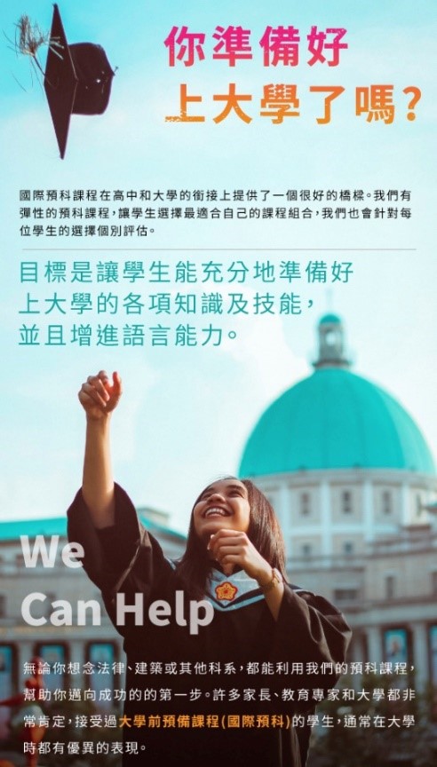 為響應政府推動國際教育,讓台灣與世界接軌,培養台灣學生成為國際化人才,讓英語成為第二母語。對於希望成立國際班,但欠缺經費支持的學校來說,選擇線上國際預科課程,無須動用龐大的人力、物力,導入昂貴的國際課程。我們可提供管理者帳戶,協助學校管理參與本課程的學生,讓學校零負擔導入國際教育,解決學校開辦國際課程師資不足、課程單一和成本過高的問題。其他教育單位如有興趣開辦,亦可比照辦理。