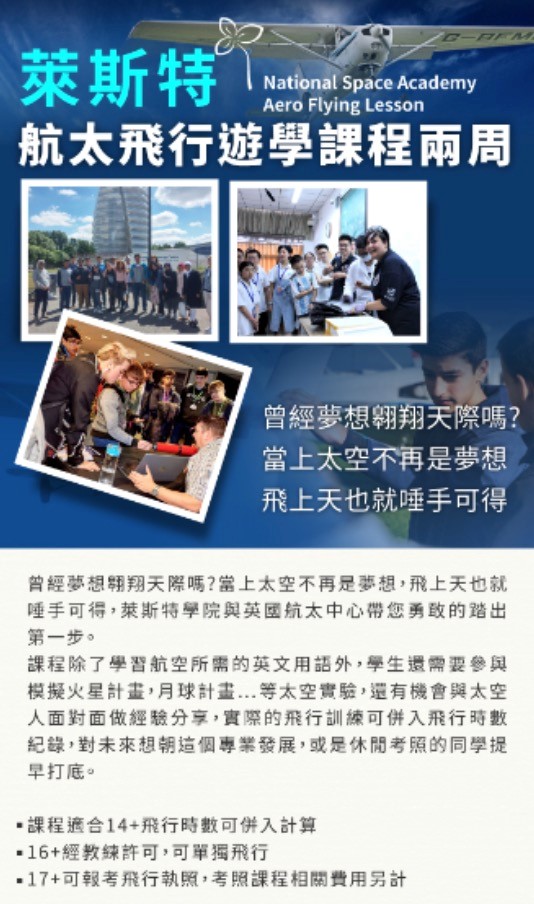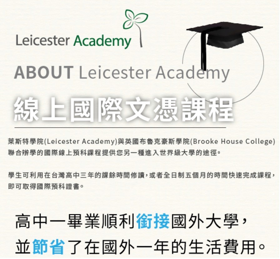 隨著線上教育的推廣,我們有幸與美國教育線上平台Grade Results Inc.合作,以線上教學的方式將英國國際預科課程(University Foundation Year) 引進台灣,並在台灣成立英國萊斯特學院Leicester Academy Taiwan,旨在提供台灣中學生多個面向的學習選擇。在兼顧國內高中課程之餘,同時培養國外的邏輯思考方式,提升未來國際競爭力與跨領域思考力。