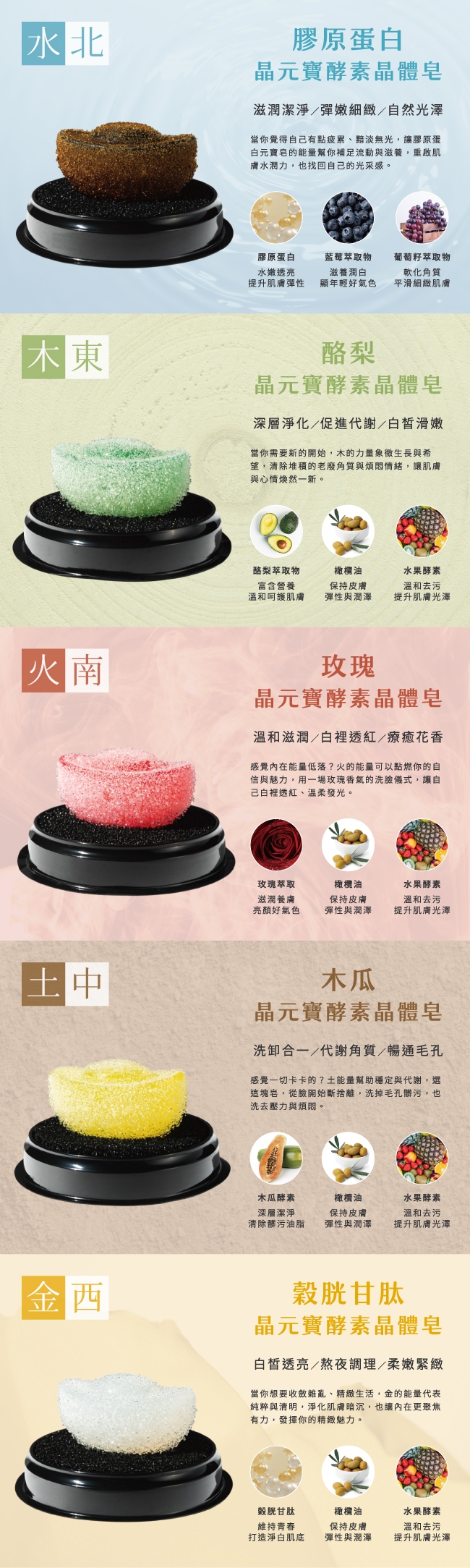 在快節奏、壓力大的生活中,我們常忽略與自己相處的片刻。晶元寶皂以五款呼應五行的設計,結合「洗顏道」精神,讓洗臉成為一場簡單、有效、療癒的自我相處儀式。依當天的情緒與狀態選擇皂款,為自己調整氣場、重拾平衡。