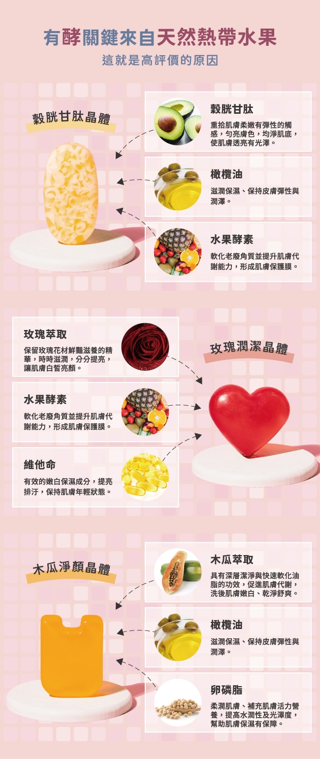 選用天然野生水果酵素,融合低溫製皂技術,於38°C喚醒酵素活性、自然生成結晶,深入清潔老廢角質、油脂與彩妝殘留,洗後肌膚清爽柔嫩,為保養吸收打下好基礎。
