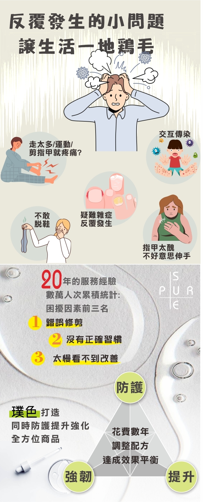 20年的手足指甲問題處理,讓我們發現有很多身體和指甲問題,是從錯誤的修剪觀念,錯誤的使用產品觀念等,這些小小的習慣開始。於是我們開始對外教育,一年多的時間,讓更多一線老師都學習到如何協助。更在這些年的客戶好轉案例的累積以及老師的反饋,反覆調整配方。