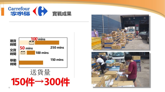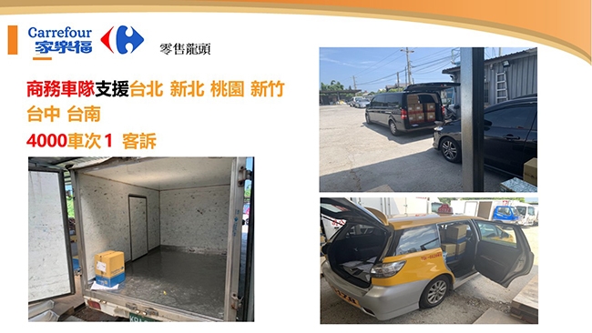 家樂福車隊合作,透過Dollycar匯入訂單節省車隊理貨時間40%,且媒合外圍司機多配送75%包裹量,效率提升將近1倍