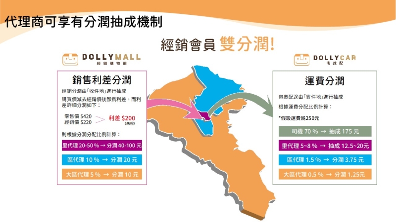 以全台灣的每個村/里為單位,成為該區域的代理人,負責管理區域內的包裹運輸狀況以及相關客服問題等,並對該區域的配送費用進行抽成。