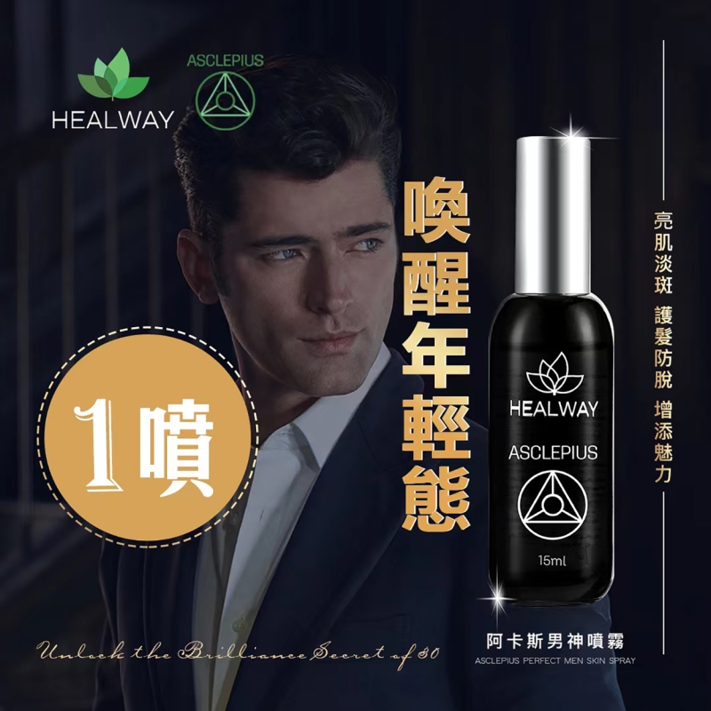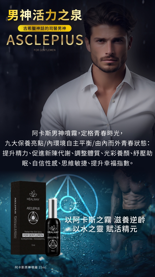 黑色瓶身的是ASCLEPIUS阿卡斯男神噴霧,其產品特色為定格青春時光,九大保養亮點/內環境自主平衡/由內而外青春狀態: