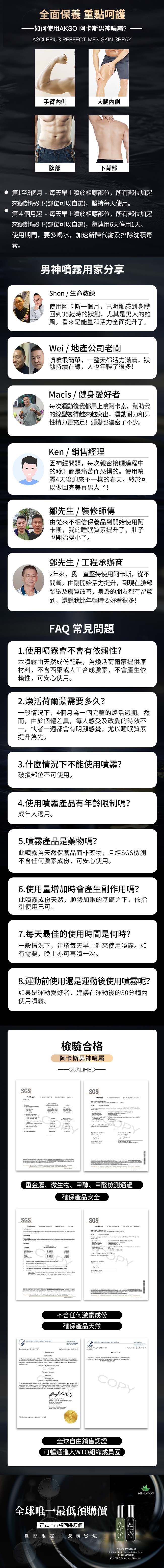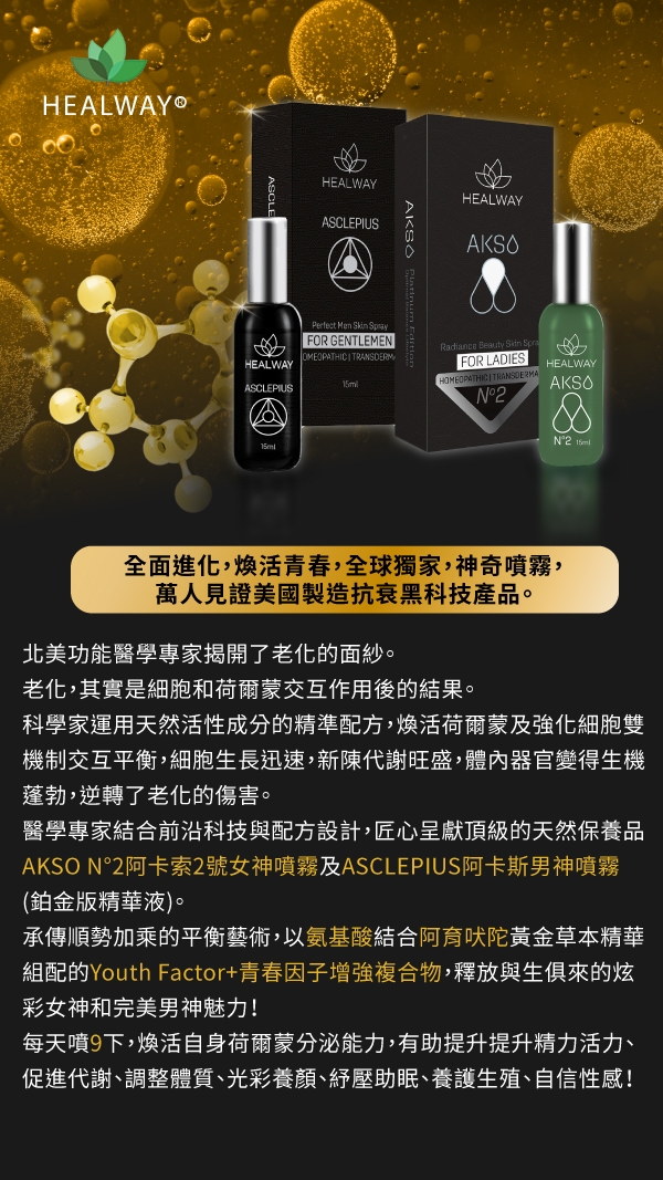 來自美國尖端科學家研發的黑科技產品,AKSO No.2阿卡索2號女神噴霧及ASCLEPIUS阿卡斯男神噴霧,可有效改善人類早衰或驟衰的退化現象。承傳順勢療癒法的平衡作用,以氨基酸結合阿育吠陀黃金草本精華組配Youth Factor+青春因子增強複合物,釋放與生俱來的炫彩女神和完美男神魅力,由內而外呈現自信年輕姿態。(本產品非臉部保護品) 噴霧產品質地清爽不黏膩,獨特透皮吸收技術安全高效。本產品已獲FDA全球自由銷售許可。經權威機構SGS安全檢測,不含激素。純天然、不含防腐劑、不含香料。本產品一經上市即廣受好評,海外單一市場銷售數量超過十數萬瓶,擁有成千上萬的見證故事。創新的阿卡索2號女神噴霧及阿卡斯男神噴霧,即將於亞太地區及台灣市場首發,特別推出嘗新預購優惠方案,全球唯一最低價,正式上市後即回復原價,敬請把握。立即開始擁抱美麗健康的非凡人生!