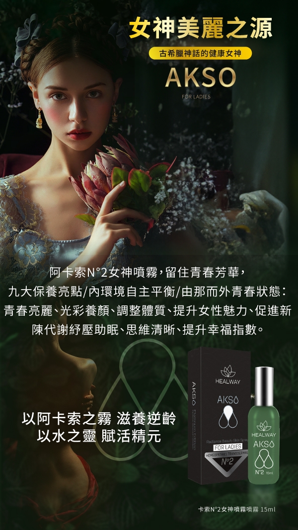 AKSO No2阿卡索2號女神噴霧,其產品特色為留住青春芳華,九大保養亮點/內環境自主平衡/由那而外青春狀態: