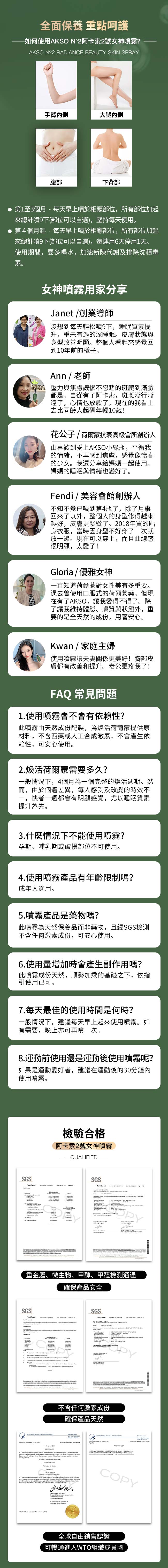 創新的阿卡索女神噴霧及阿卡斯男神噴霧,直噴身體4個透皮吸收最佳的部位,手臂內側,大腿內側,腹部,下背部(網頁上有圖解說明)。每天噴9下,留住芳華,定格時光,從體內到體外呈現緊緻年輕的狀熊,擁抱真正美麗健康的非凡人生。