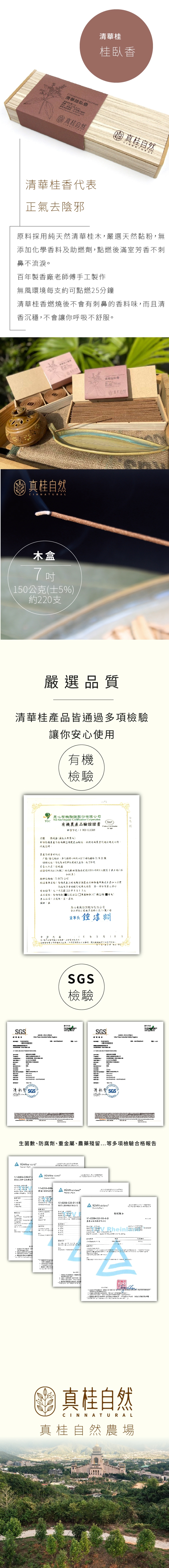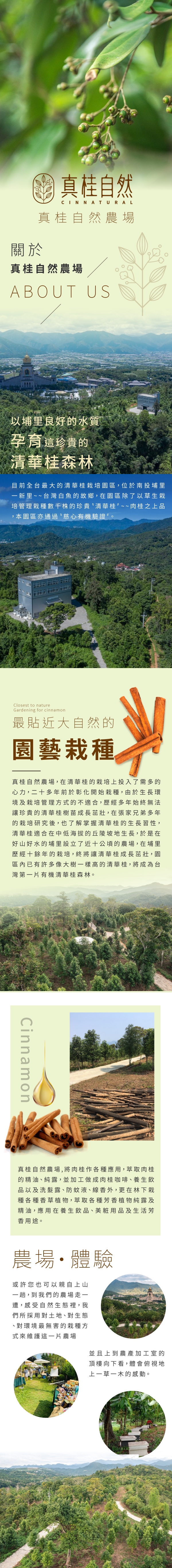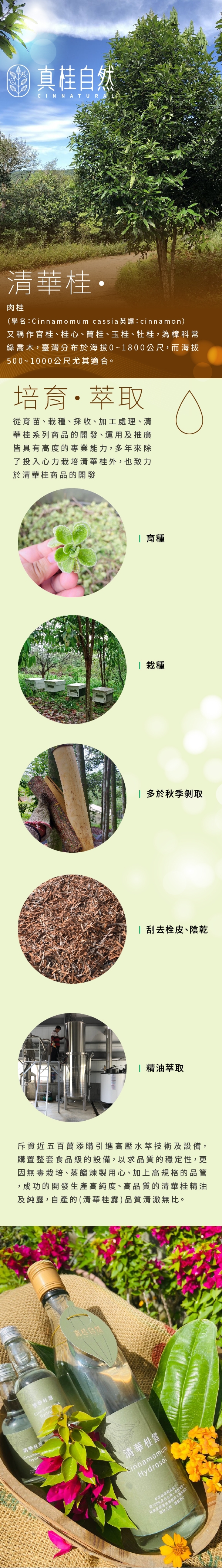 「真桂自然農場」秉持「真桂自然,自然珍貴」的理念,以自然法則堅持無毒有機栽種,表達友善土地的心,持續發展有機農業,深刻體會自然取之不易,更顯得珍貴。 「清華桂」適合生長在中低海拔的丘陵坡地,種植於南投埔里,佔地三公頃,歷經十餘年的栽培,目前為全台最大的有機清華桂森林。