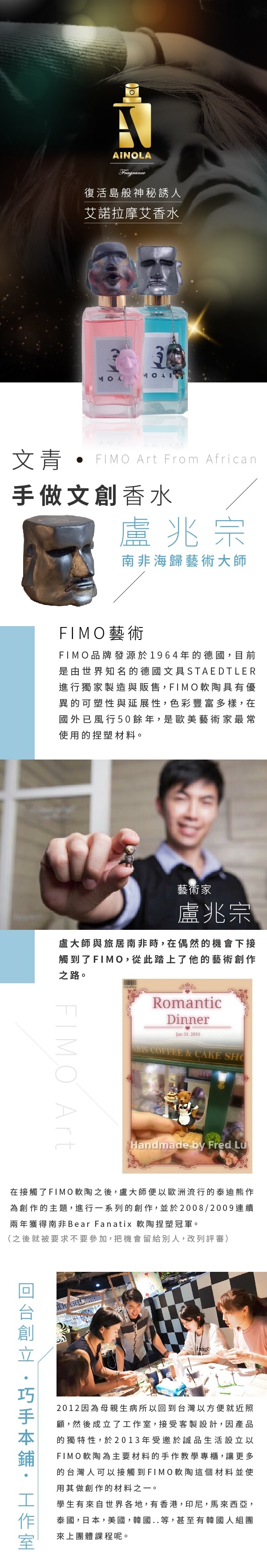 盧大師與旅居南非期間,無意間接觸到了FIMO 軟陶,於是展開了他的創作之路,期間,盧大師連續兩年於南非Bear Fanatix 獲得捏塑冠軍。 回台之後創立了巧手本舖,專注於袖珍藝術的創作,常獲媒體採訪,並與多家知名企業合作。