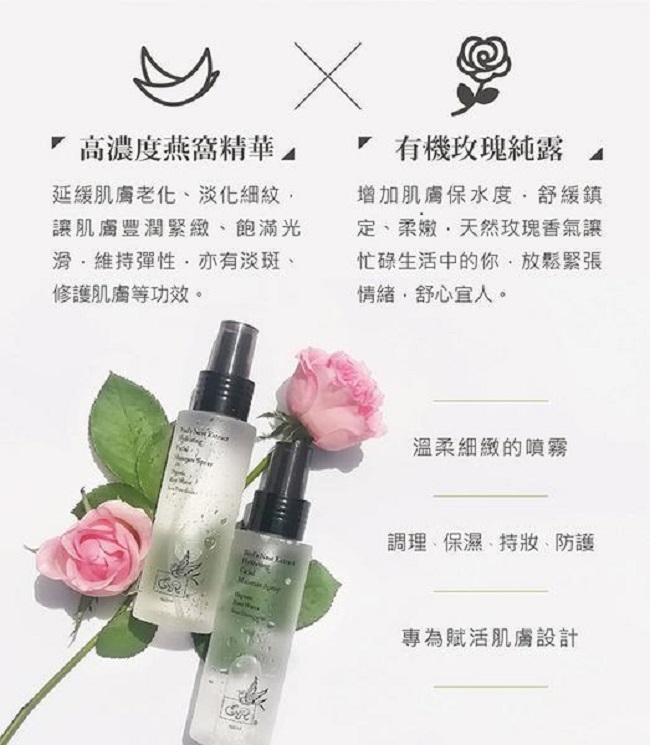 精萃燕窩 有機玫瑰水潤保濕噴霧 -100ml 定價 $980 • 高達55%以上的「保加利亞有機玫瑰純露」,讓你用到的不是只有水。 • 日本進口高濃度「燕窩精華」。 • 添加獨特5種中藥植萃淨白配方,能抑制黑色素生成、淨白、改善肌膚暗沉。 • 可做化妝水、妝後使用可定妝持妝、室內冷氣房乾燥補水、戶外炎熱降溫補水。