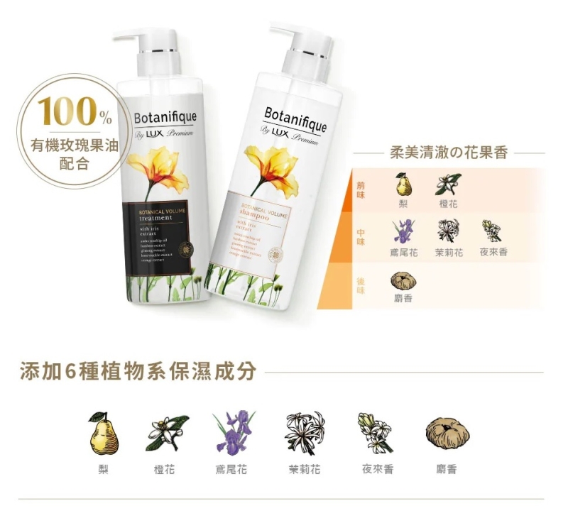 LUX麗仕-瑰植卉植萃輕盈保濕洗髮精 510g 3入 6種植物系保濕成分 來自法國奧弗涅的火山水,含豐富礦物元素,幫助髮絲強韌 洗髮精無矽靈,綿密的泡沫能溫和地洗淨頭皮與髮絲 全系列皆不含Parabens防腐劑與合成著色劑添加 產地 : 日本