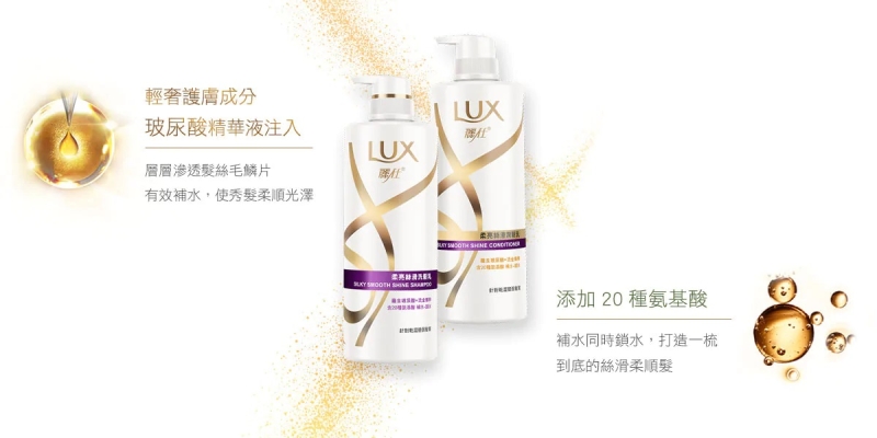 Lux麗仕-柔亮絲滑潤髮乳 (乾澀脆弱髮質) 650ML 3入 輕奢護膚成分-玻尿酸注入,層層*滲透髮絲有效補水,使秀髮柔順有光澤 *於毛鱗片層 流金臻粹注入,蘊含細小金色珠光粒子;配方可以讓秀髮煥發夢幻光澤 含20種氨基酸,補水同時鎖水,幫助秀髮恢復如絲般柔順 產地 : 中國