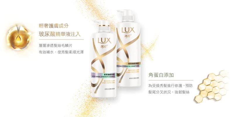 Lux麗仕-柔亮強韌潤髮乳 (分叉無光澤髮質) 650ML 3入 輕奢護膚成分-玻尿酸注入,層層*滲透髮絲有效補水,使秀髮柔順有光澤 *於毛鱗片層 角蛋白添加,分叉無光澤髮適用,為受損秀髮進行修護,預防髮尾分叉狀況並強韌髮絲 流金臻粹注入,蘊含細小金色珠光粒子;配方可以讓秀髮煥發夢幻光澤 產地 : 中國
