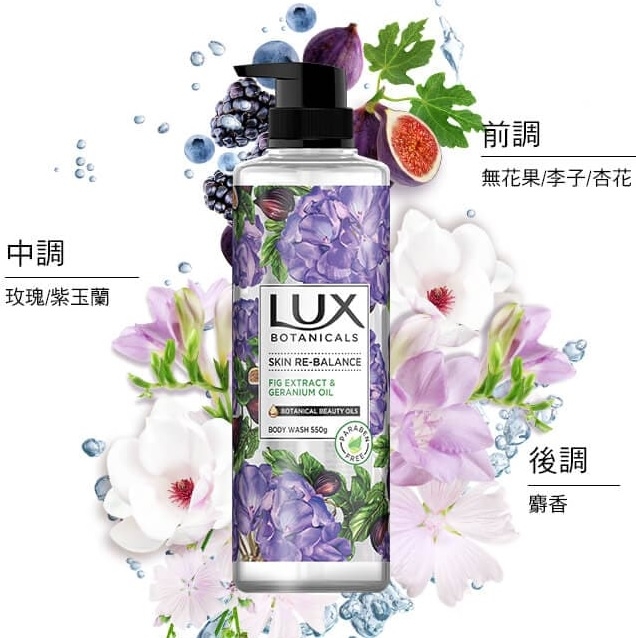 LUX麗仕-植萃香氛沐浴露 (甜美無花果-平衡舒緩) 550g 3入 無花果與杏花交織出的沁甜果香 嚴選100% 天然來源天竺葵精油 使肌膚水潤舒緩 產地 : 中國