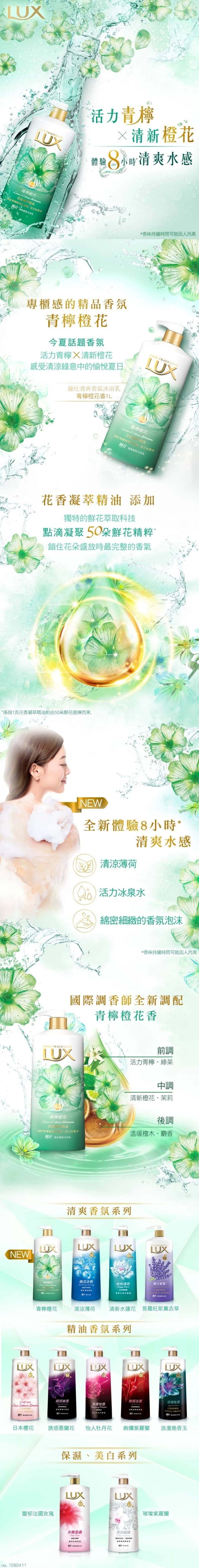LUX麗仕-清爽香氛沐浴乳-青檸橙花 1L 3入 活力青檸 X 清新橙花 國際調香師知名之作,與香水一樣有前中後味 花香凝萃精油添加 清涼薄荷與活力冰泉水,全新體驗8小時清爽水感 產地 : 中國
