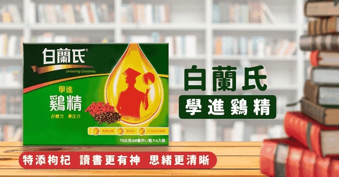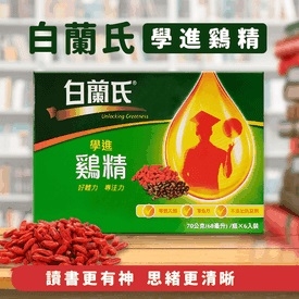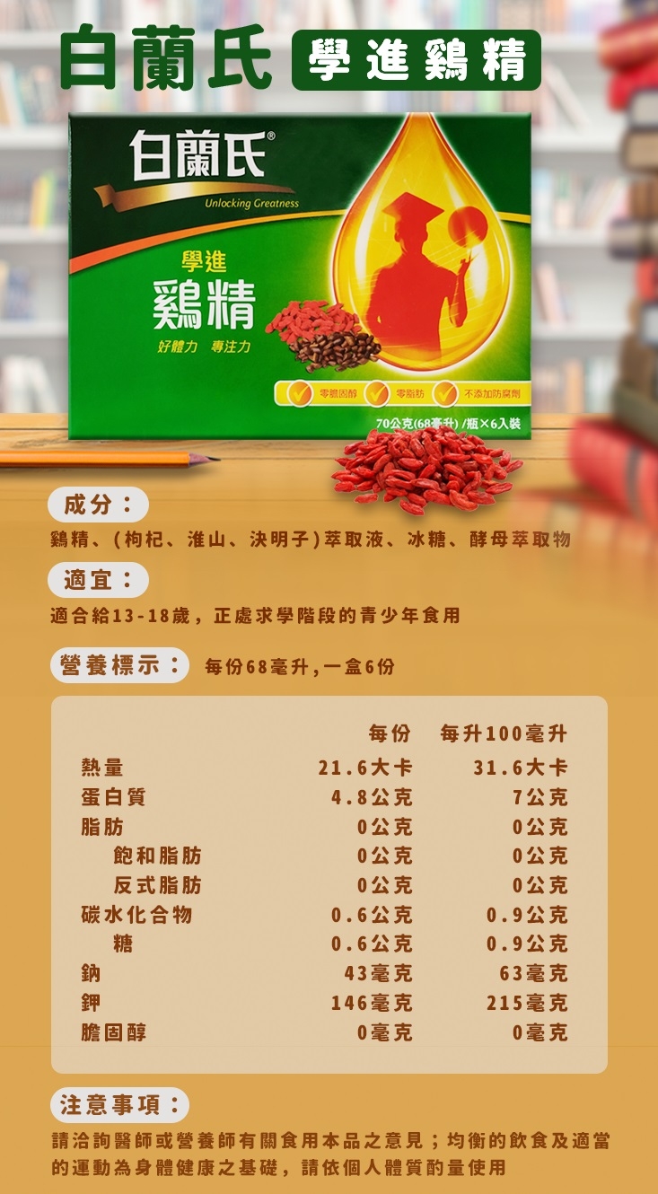 Brand's白蘭氏-學進鷄精70g*6瓶裝 白蘭氏學進鷄精,採用符合國家優良肉品標準的鷄隻生產,萃取鷄肉精華,獨家添加枸杞、決明子、淮山精燉而成,與鷄精中豐富的胺基酸,讓你維持好體力外,滿分專注力、讀書更犀利。 本品經離心去油處理,零脂肪、零膽固醇、採真空封蓋保存,不添加防腐劑,天天飲用健康無負擔。 主要成分 : 雞精、(枸杞、淮山、決明子)萃取液、冰糖、酵母萃取物 營養標示 : 每份 68 毫升 熱量 21.6大卡 蛋白質 4.8 公克 脂肪 0 公克 飽和脂肪 0 公克 反式脂肪 0 公克 碳水化合物 0.4 公克 鈉 43 毫克 膽固醇 0 毫克 包裝內容 : 6入/盒 淨重70公克(68毫升)/瓶 產地 : 台灣 建議用量 : 可選直接飲用。要讓雞精更好喝,建議可冷藏或溫熱後飲用。(請勿直接將雞精瓶置入微波爐中加熱) 開瓶後,請立即飲完 建議用量:每天一瓶 *如有特殊體質,請向專業人士諮詢 保存期限 : 如包裝標示 保存方式 : 避免將本產品置於潮濕、高溫或曝曬等場所 食品業者登錄字號 : A-127930041-00003-7
