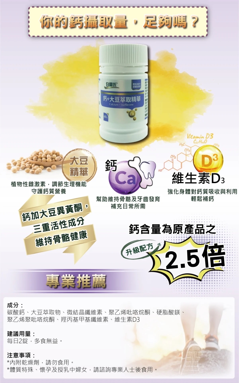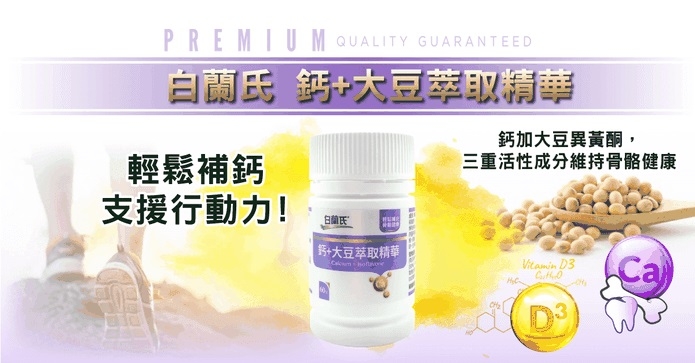 Brand's白蘭氏-鈣+大豆萃取精華 60錠/盒 建議用量:每日2錠,一日請勿超過2錠,多食無益。 有效期限:如包裝所示 成分:碳酸鈣、大豆萃取物、微結晶纖維素、聚乙烯吡咯烷酮、硬脂酸鎂、聚乙烯聚吡咯烷酮、羥丙基甲基纖維素、維生素D3(辛烯基丁二酸鈉澱粉、蔗糖、抗壞血酸鈉、中鏈三酸甘油酯、二氧化矽、生育醇、維生素D3) 食品添加物:碳酸鈣、聚乙烯吡咯烷酮、硬脂酸鎂、聚乙烯聚吡咯烷酮、羥丙基甲基纖維素、辛烯基丁二酸鈉澱粉、抗壞血酸鈉、二氧化矽、生育醇、維生素D3 食品業者登錄字號:A-127930041-00000-4 產地:台灣