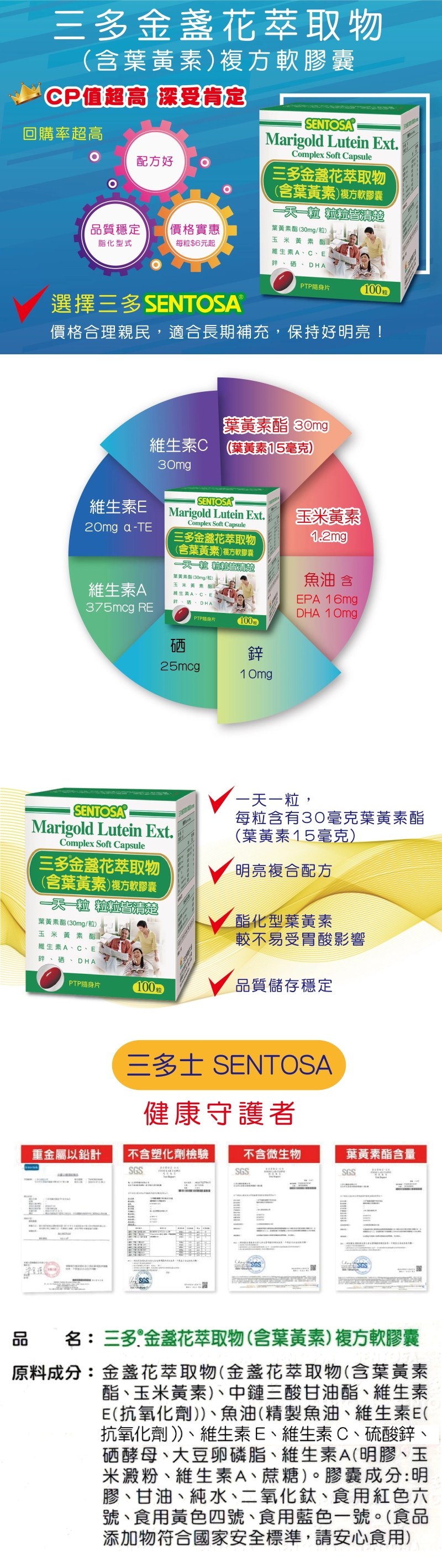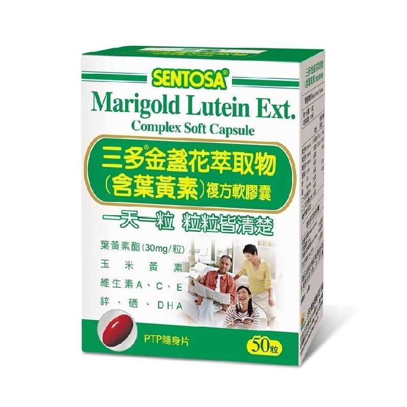 Sentosa三多-金盞花萃取物(含葉黃素)複方軟膠囊 50粒/盒 規格:0.5g±10%/粒 包裝方式:外-紙盒、內-PTP隨身片 食用方法:1.成人、青少年︰每次1粒,每日1次。 2.餐後補充,請搭配溫、冷開水食用。 產地:台灣 成份:如圖所示 效期:如包裝所示 食品業者登錄字號 A-112197725-00000-2