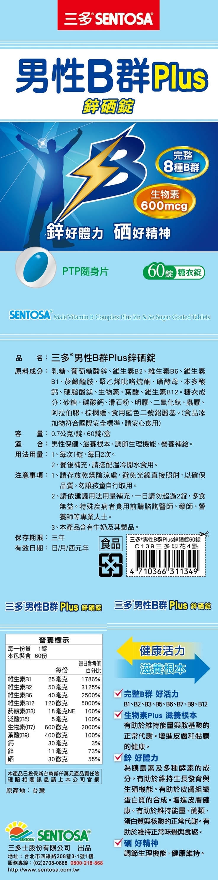 Sentosa三多-男性B群Plus鋅硒錠 60錠/盒