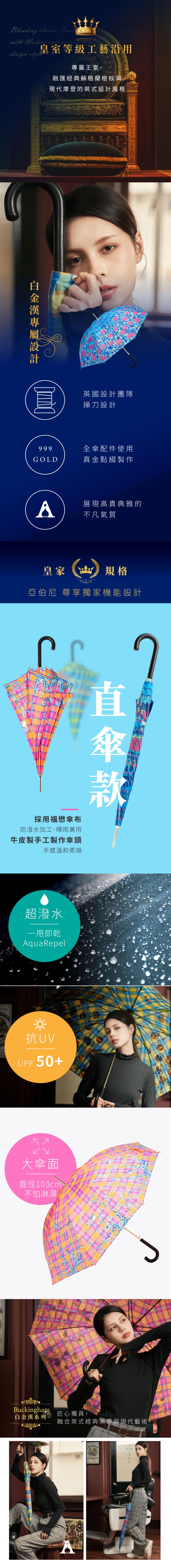 【亞伯尼-白金漢直骨自動傘 A.Brolly-Buckingham auto regular umbrella】 自蘇格蘭格紋出現在世上已經過了1700多年,在18世紀時,正式成為皇家與貴族的象徵,早已是公認的經典,正如白金漢宮在人們心中的地位。 但亞伯尼認為經典不止於經典,白金漢系列將經典元素加上現代摩登的設計,決心使白金漢再次突破框架。 √匠心獨具, 融合英式經典美學與現代藝術 √經典蘇格蘭格紋與現代摩登的英式設計風格 √白金漢系列專屬設計,英國團隊操刀設計 √使用真金點綴製作,展現高貴典雅的氣質