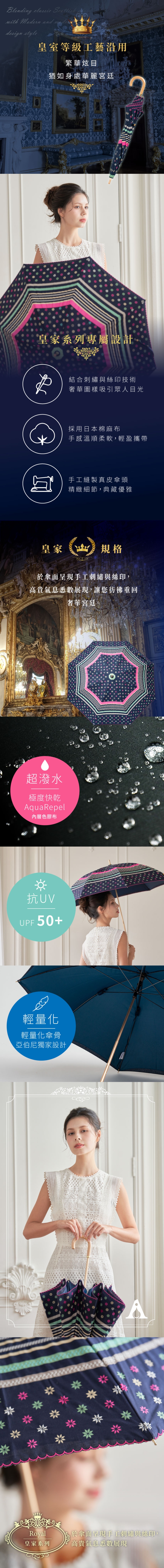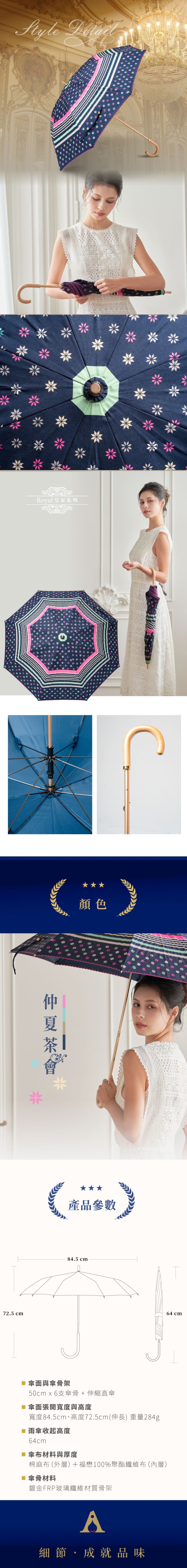 【亞伯尼-皇家刺繡手工傘-仲夏茶會 A.Brolly-Royal manual regular umbrella】 身為萬人之上的皇族,吃穿用度也必定與尋常他人大不相同且獨一無二,展現出與眾不同的氣質。皇家系列的圖樣設計璀璨絢麗,卻不失典雅高貴的底蘊,以手工刺繡結合手工絲印技術,展現皇室成員不落俗塵的優雅氣質。 √繁華炫目,猶如身處華麗宮廷 √手工縫製真皮傘頭,精緻細節,典藏優雅 √結合刺繡與絲印技術,奢華圖樣吸引眾人目光 √採用日本棉麻布,手感溫順柔軟,輕盈攜帶